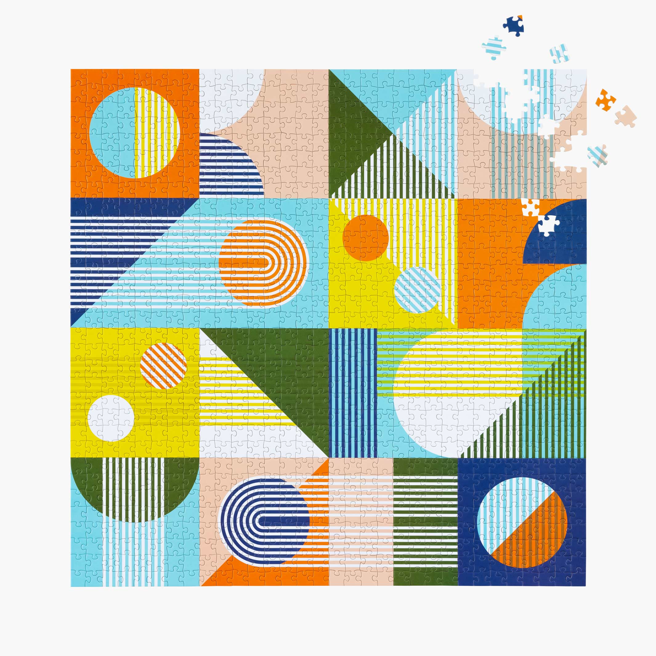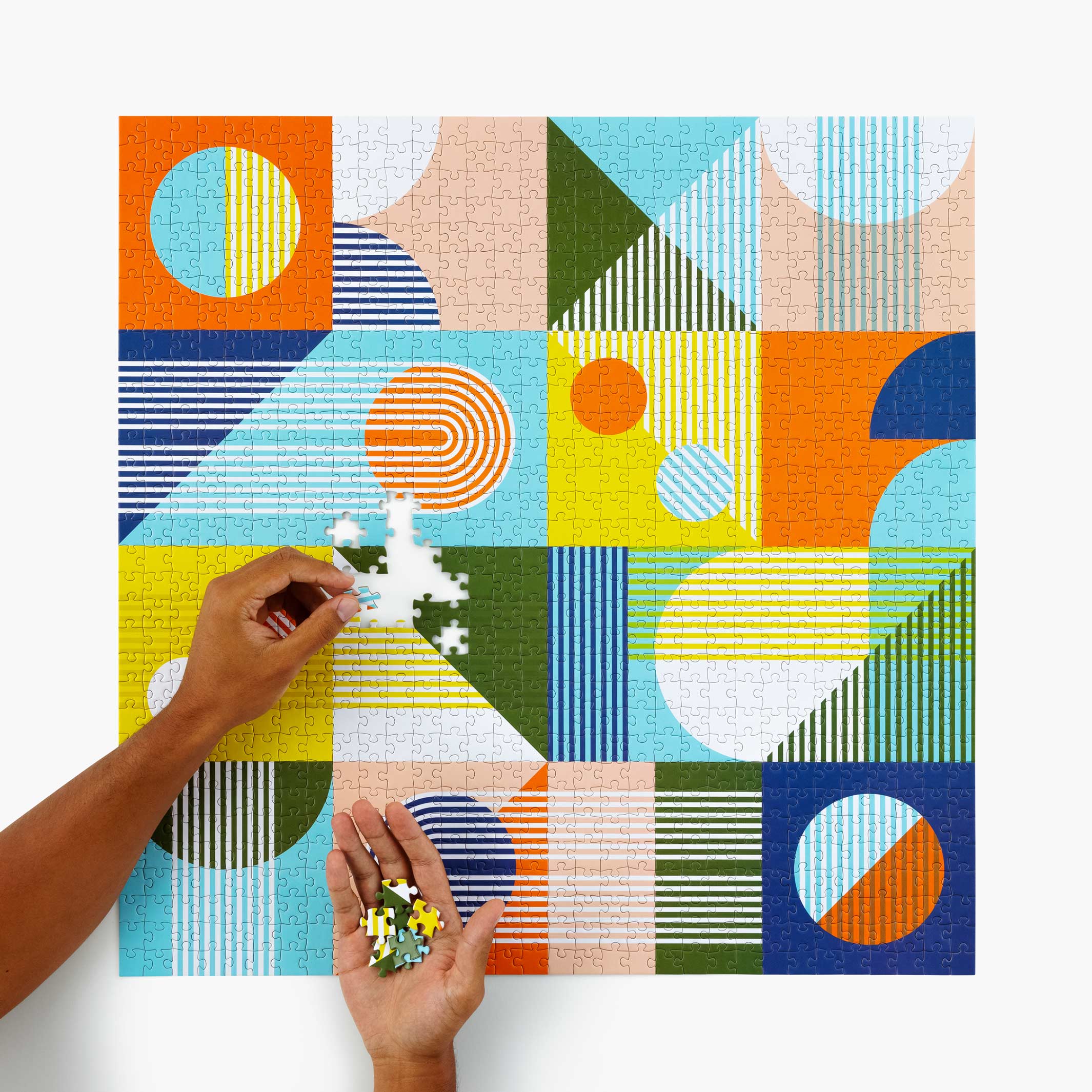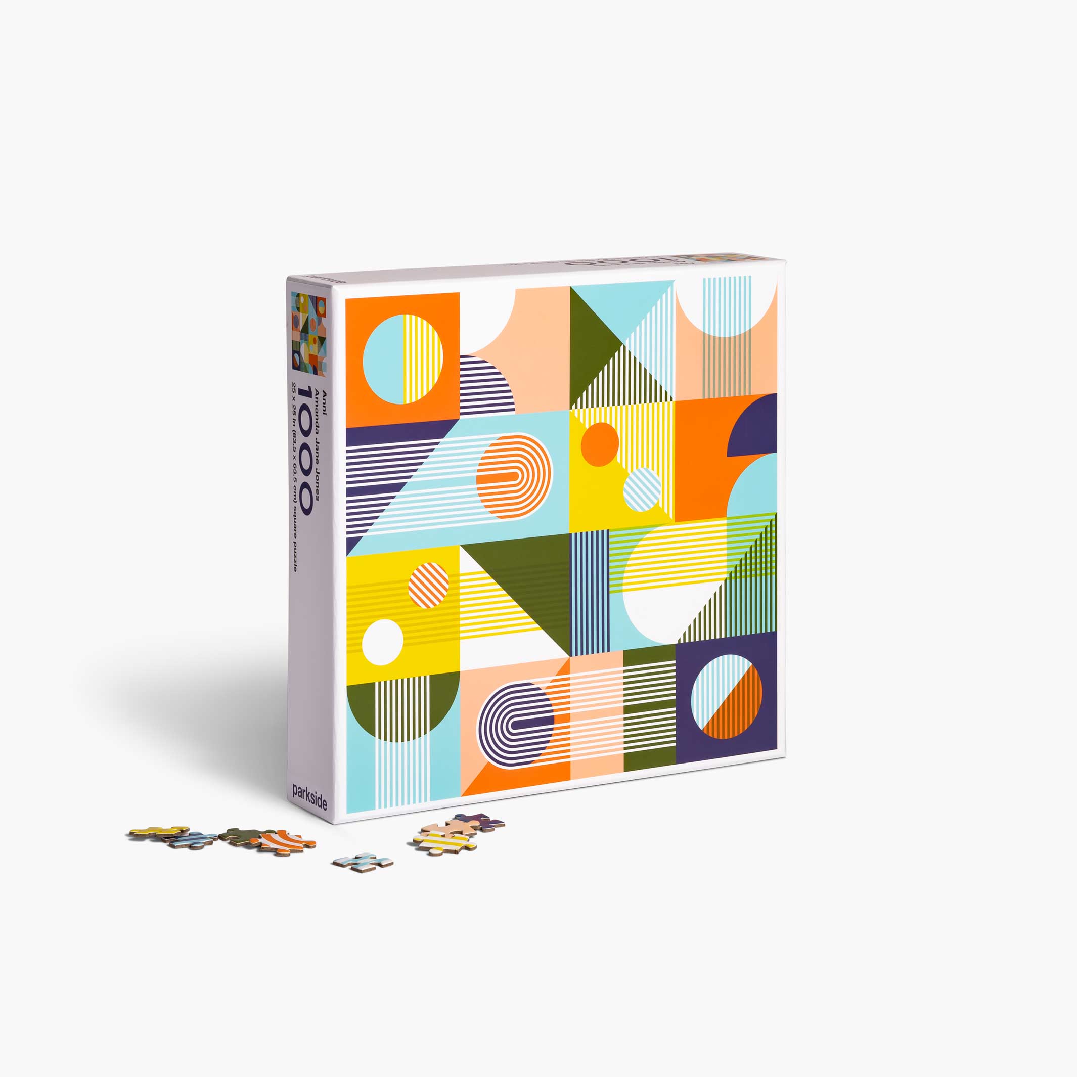Dieses 1000-teilige, 63,5 cm große Puzzle mit dem Titel Anni ist nach der deutsch-amerikanischen Textilkünstlerin Anni Albers benannt, deren bahnbrechende Arbeit auf dem Gebiet der Weberei eine Inspirationsquelle für Amandas Illustrationen war. Wie Albers kreiert Amanda auffällige visuelle Designs, indem sie kontrastierende Elemente schichtet und ineinandergreift. Mit einer starken grafischen Sensibilität ist Anni ein Patchwork-Spielfeld, das einfache Formen und Muster in einer raffinierten Farbpalette verwendet, um ein lebendiges Gefühl der Bewegung zu erzeugen.