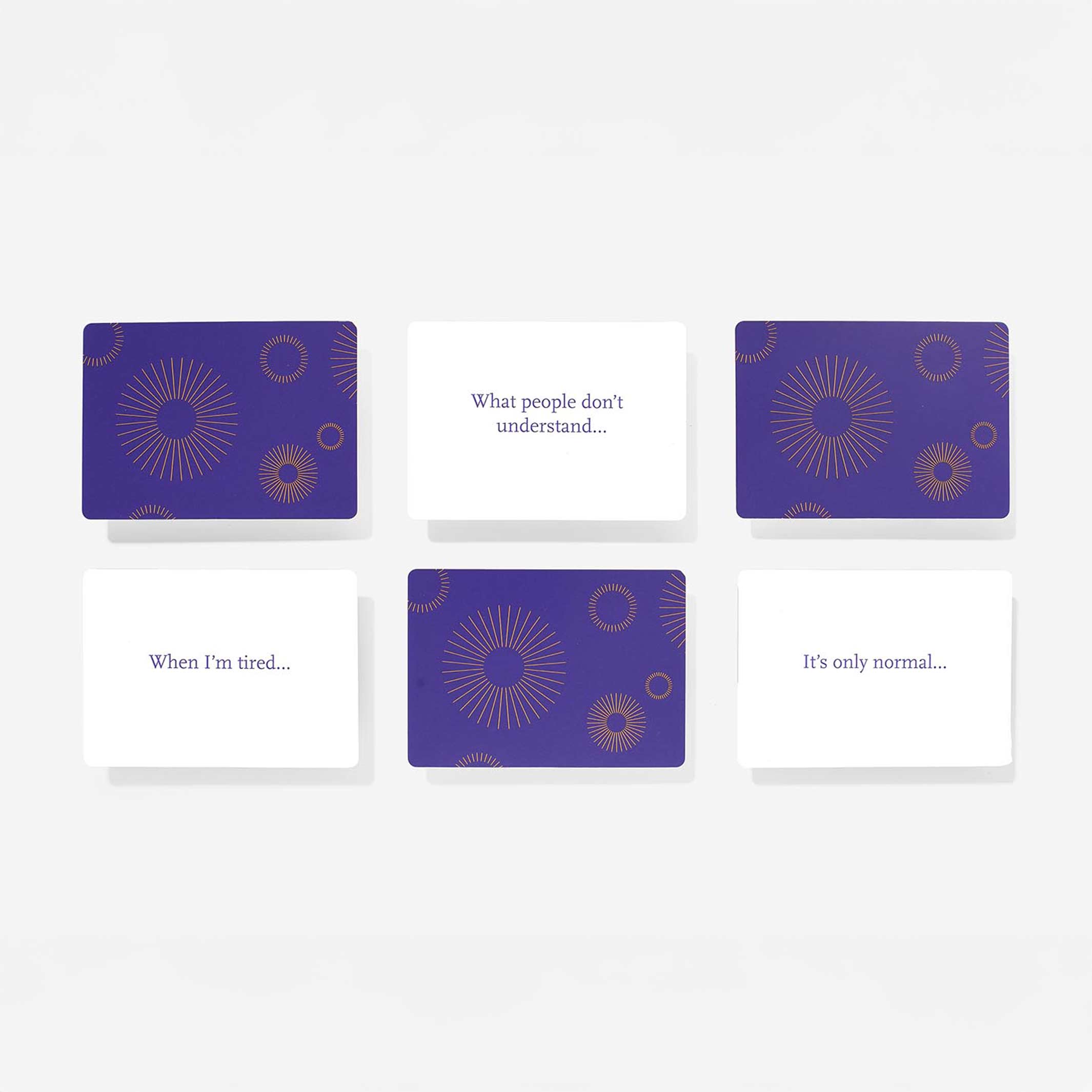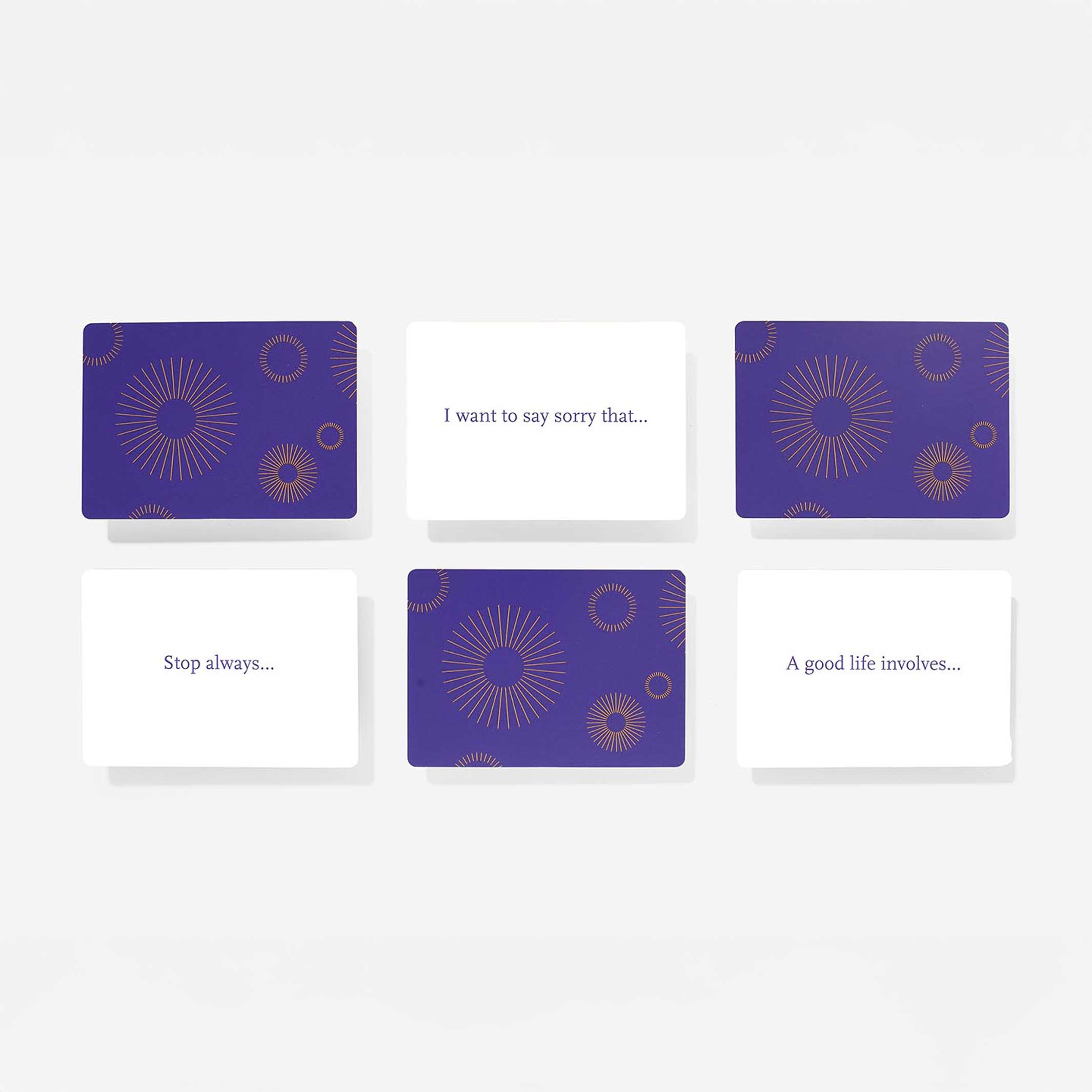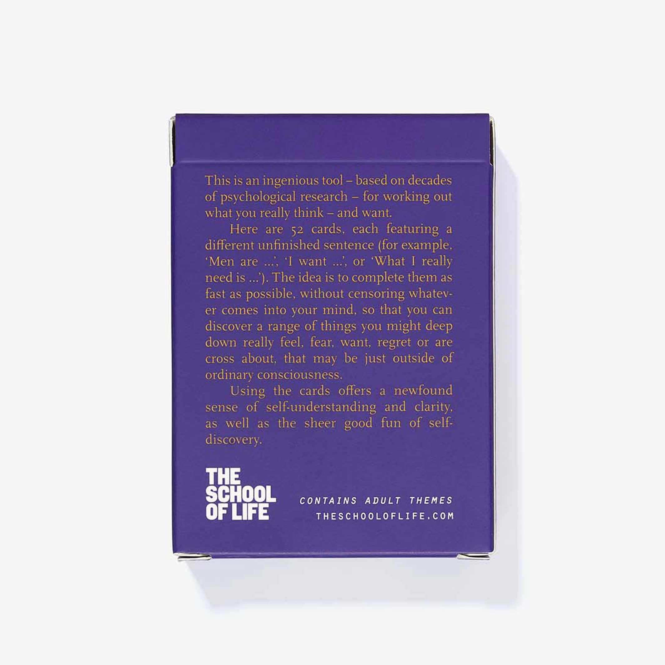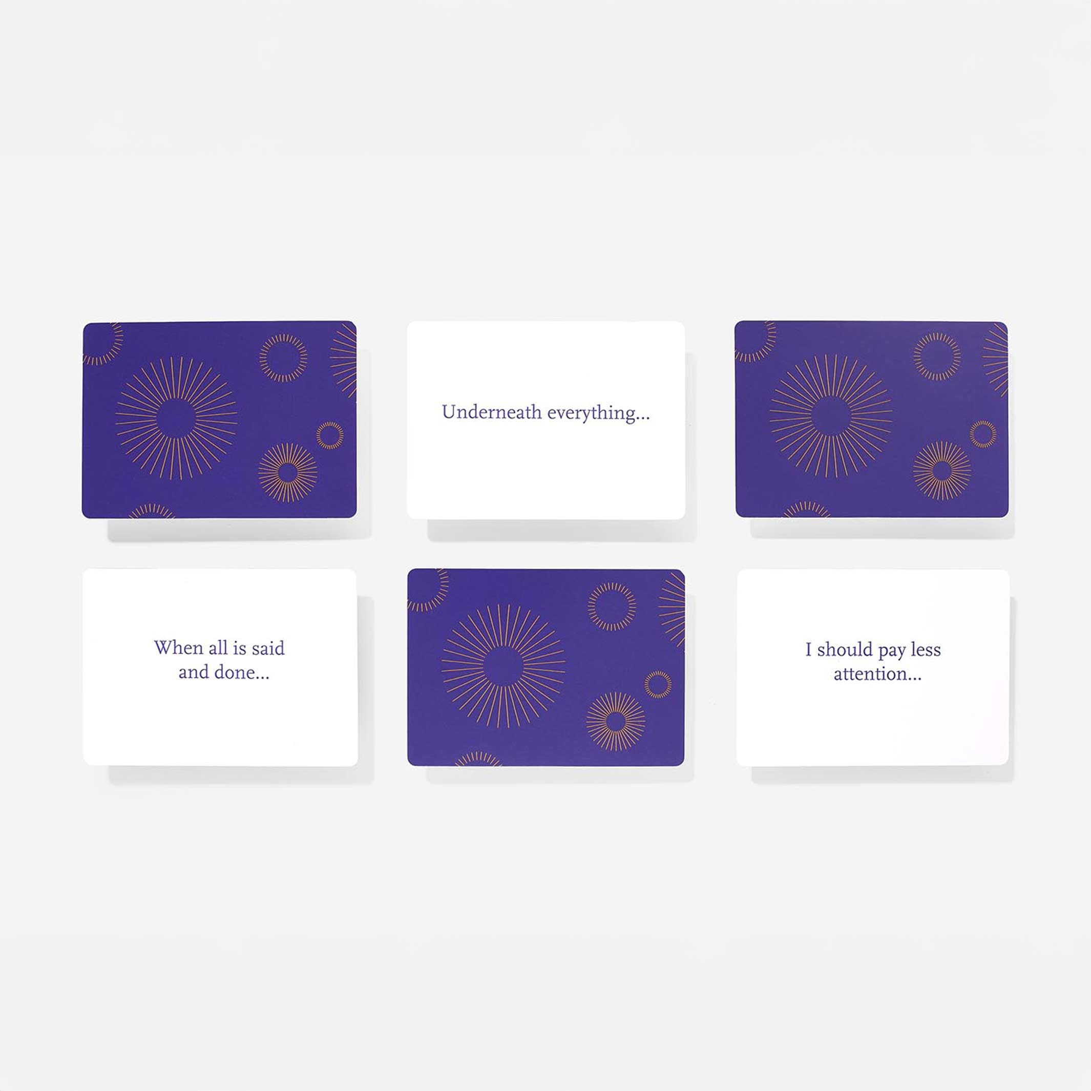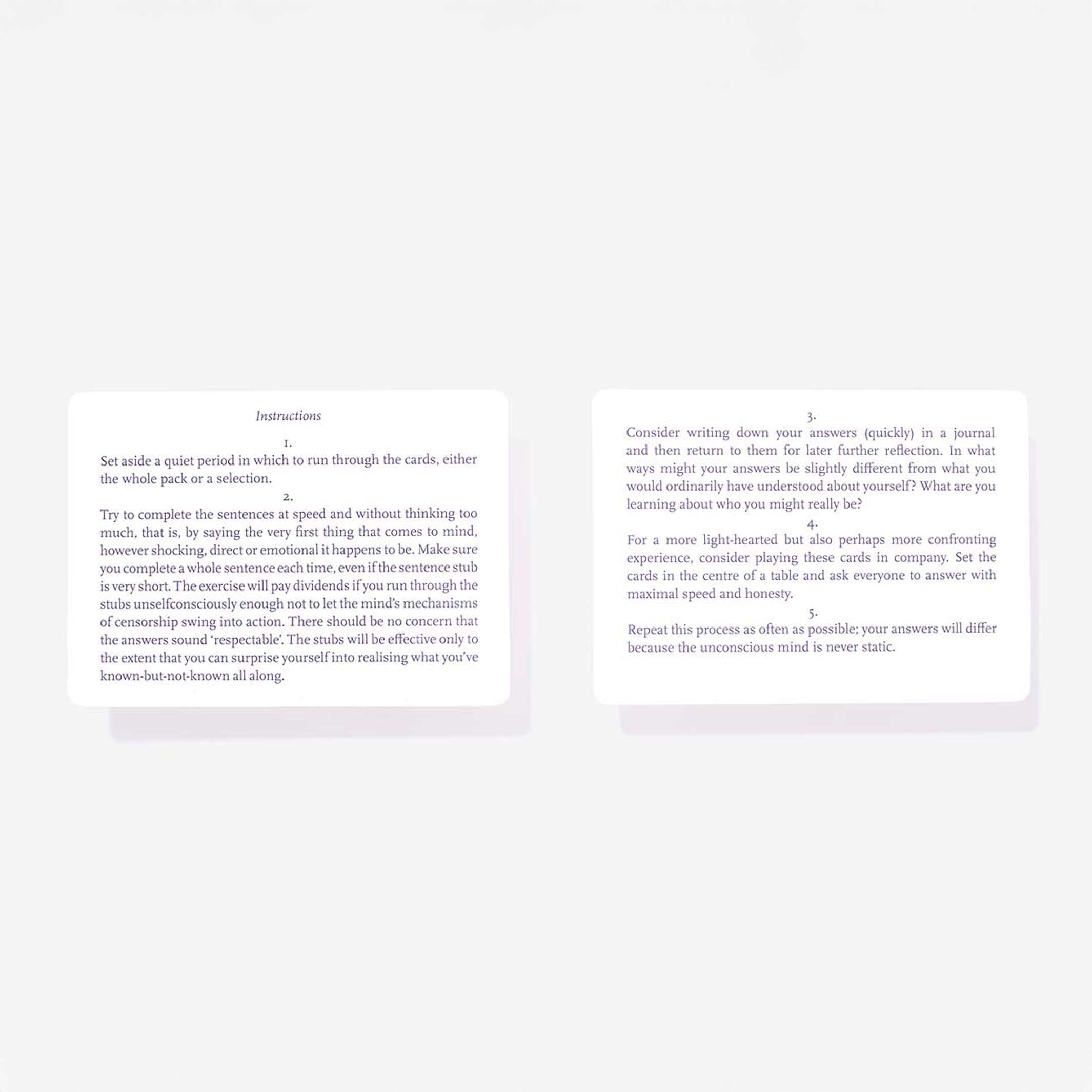 Auf 52 Karten ist jeweils ein anderer unvollendeter Satz abgebildet (z. B. ‘Men are …’, ‘I want …’, or ‘What I really need is …’). Die Idee ist, sie so schnell wie möglich zu vervollständigen, ohne zu zensieren, was auch immer Dir in den Sinn kommt, so dass Du eine Reihe von Dingen entdecken kannst, die Du tief in Deinem Inneren wirklich fühlst, fürchtest, willst, bedauerst oder über die Du Dich ärgerst, die vielleicht nur außerhalb des gewöhnlichen Bewusstseins liegen. Die Verwendung der Karten bietet ein neues Gefühl der Selbsterkenntnis und Klarheit sowie den Spaß an der Selbsterkenntnis.