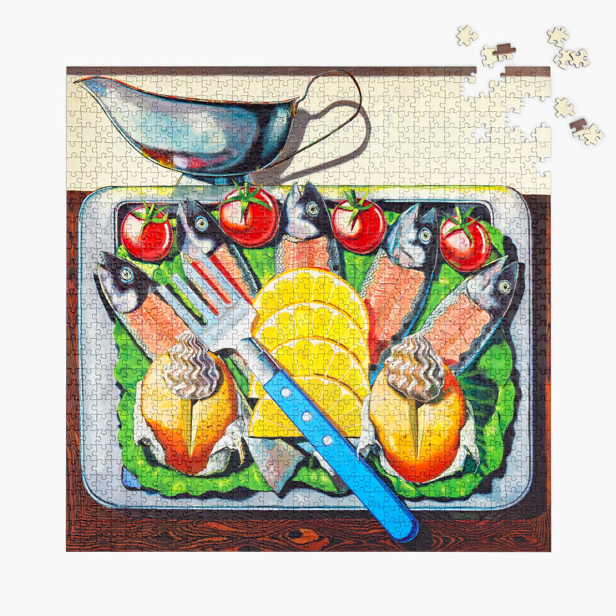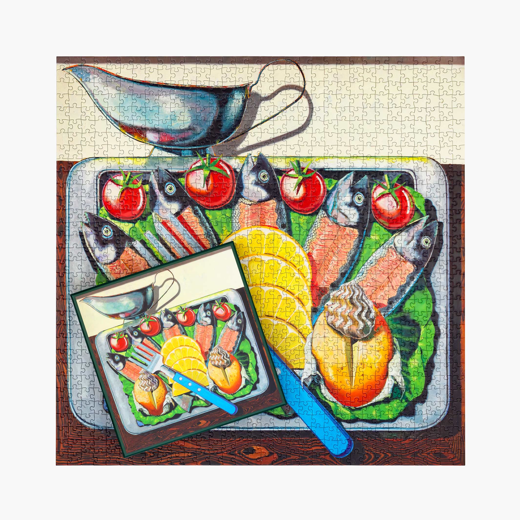 Dieses 1000-teilige, 63,5 cm große, quadratische Puzzle mit dem Titel Fourchette (Gabel) wurde von den Lebensmittelillustrationen in Ons Kookboek inspiriert, einem alten flämischen Kochbuch, das von Kristofs Mutter geliebt wurde und in vielen belgischen Küchen zu finden ist. In diesem Gemälde ist das Essen in einer stilisierten, symmetrischen Anordnung angeordnet, die typisch für das Food-Styling aus dieser Zeit ist und dem Werk eine starke grafische Sensibilität verleiht.