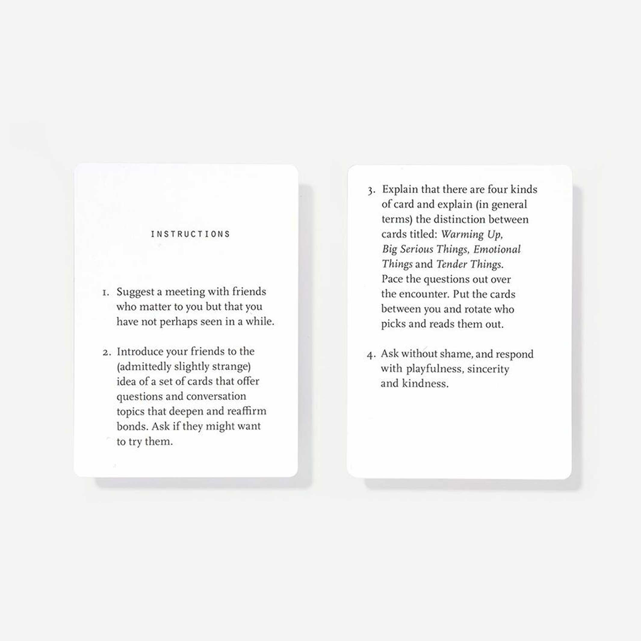 Meeting Friends ist ein Satz von 52 Karten von The School of Life mit Fragen und Übungen für tiefere und sinnvollere Gespräche mit Freunden.