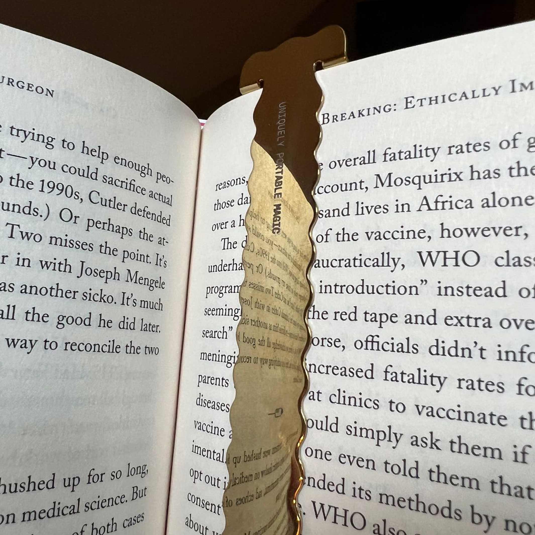 Die gebogenen Ecken des Lesezeichens (in unserem Büro auch als "Reißzähne" bezeichnet) sind sorgfältig durchdacht und ausgewogen, so dass Ihr Buch sauber geschlossen werden kann und Sie Ihren Platz nicht ganz verlieren (uns graut vor dem Gedanken).